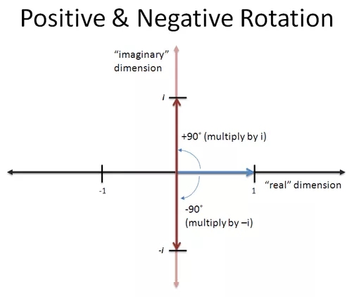 呀!如果我们在想想,会发现将其在其他方向(顺时针)旋转两次也能将 1 转换为 -1。这是一个“负”旋转或者说乘以 -i: