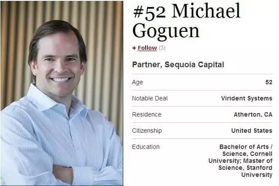 Michael Goguen曾效力红杉资本长达20年,期间参与投资了许多知名项目或者公司,例如苹果、谷歌、Youtube、Paypal、Dropbox等, 当受害者在加州提出刑事诉讼后,Goguen离开了红杉资本。