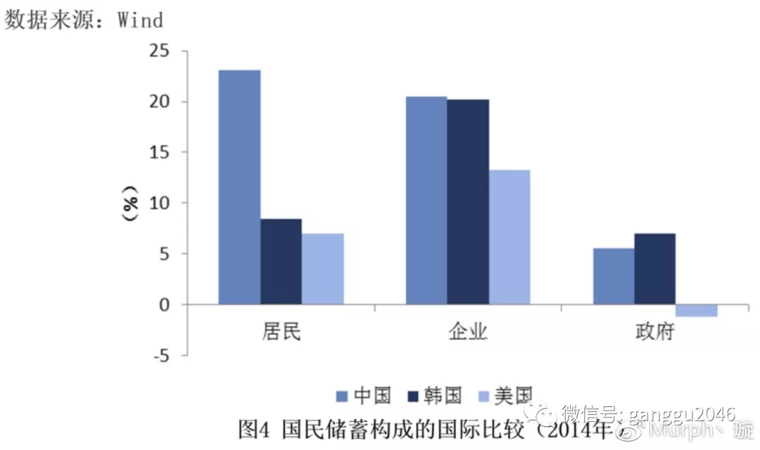 如图为各国国民储蓄率(国民储蓄 = 政府储蓄 + 居民储蓄 + 企业储蓄)的比较,中国高居榜首。经济发展最快的几个国家,韩国,印度,德国的储蓄率都很高。可以说,如果没有高水平的储蓄率,中国是不可能实现如此快速的经济增长的。
