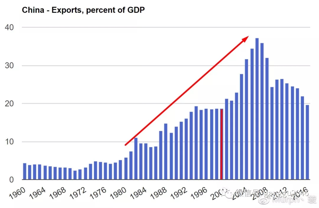 如图为中国出口总额占GDP的比,可以看到从改革开放之后它一直在快速的上升,2001年加入WTO之后更是几乎变成了一条直线。