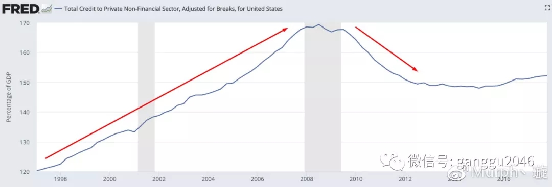 如图为美国私人债务占GDP的比。我们可以看到在2008年爆发次贷危机前的十年中美国的这一比率有大幅的上涨。