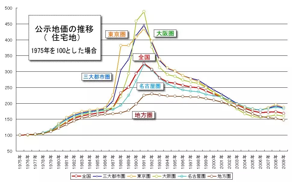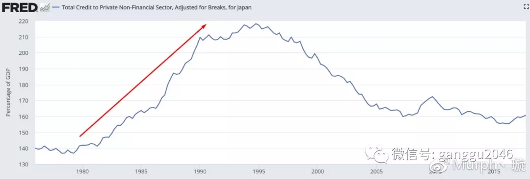 如图,日本在1990年爆发经济危机之前的十年中也有债务与GDP的比飞涨的现象,因为它也经历了严重的房地产泡沫。我们都知道,危机之后,日本房价下跌了近三十年(下跌幅度超过65%),日本经济陷入了失去的三十年。
