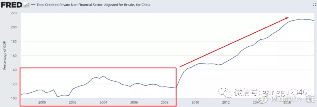如图为中国私人债务占GDP的比。我们可以看到在中国经济发展最繁荣的阶段,即2001至2008这几年,虽然债务本身也在飞速的增长,但由于经济(收入)的增速也很快,所以债务与GDP的比几乎没有什么变化。按照Ray的标准,我们可以说那些年所增加的债务都是好债务,它们被投资在了可以产生经济效益的地方。