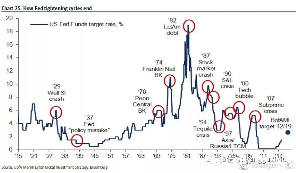 有趣的是美国银行首席投资策略师Michael Hartnett在最近做了一张图告诉我们过去每一次美联储的加息周期都导致了世界上的某个地方爆发了经济危机。