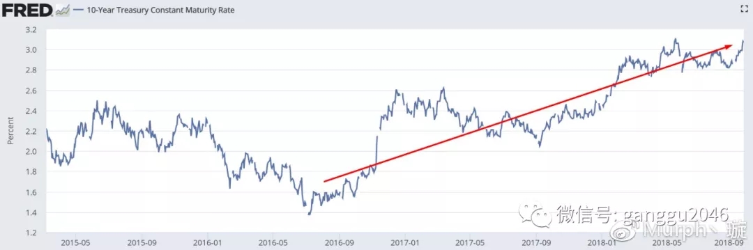 如图,美国十年期国债的收益率也刚刚再次超过3%。之前我们讨论资本外逃时曾经讨论过它是由于中国经济竞争力下降,进而导致资本向海外寻求能够带来更高风险收益比的资产。而美国国债在金融市场上被认为是零风险资产,当它的收益率越来越高时,就会不断吸引全世界的资本。