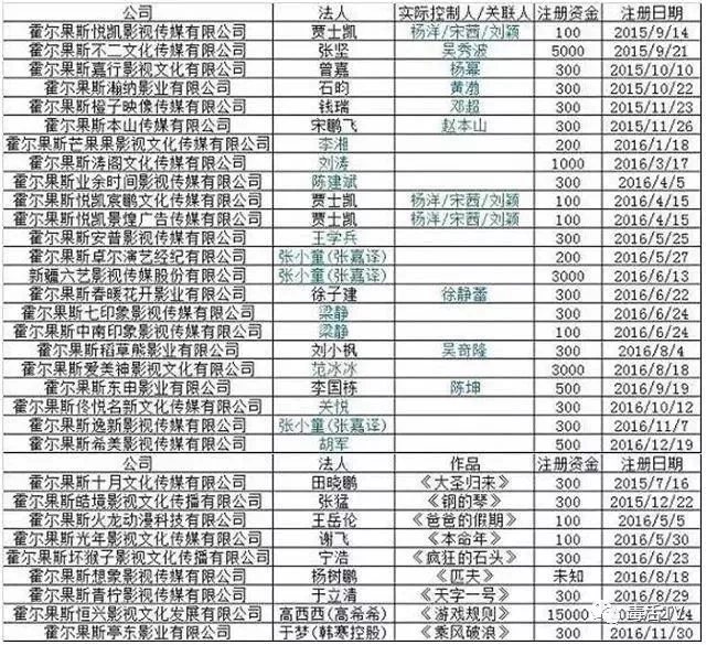 《大闹天竺》、《火锅英雄》等电影出品方中的霍尔果斯青春光线,《老炮儿》和《使徒行者》里的霍尔果斯春天融合传媒,《战狼Ⅱ》里的霍尔果斯登峰国际文化传播有限公司,由韩寒导演、邓超主演的电影《乘风破浪》,在制片信息和出品信息中也有两家霍尔果斯影视公司,分别是霍尔果斯橙子映像传媒有限公司和霍尔果斯亭东影业有限公司,网红咪蒙(马凌)也注册了一家名为霍尔果斯爆炸糖影视传媒有限公司……