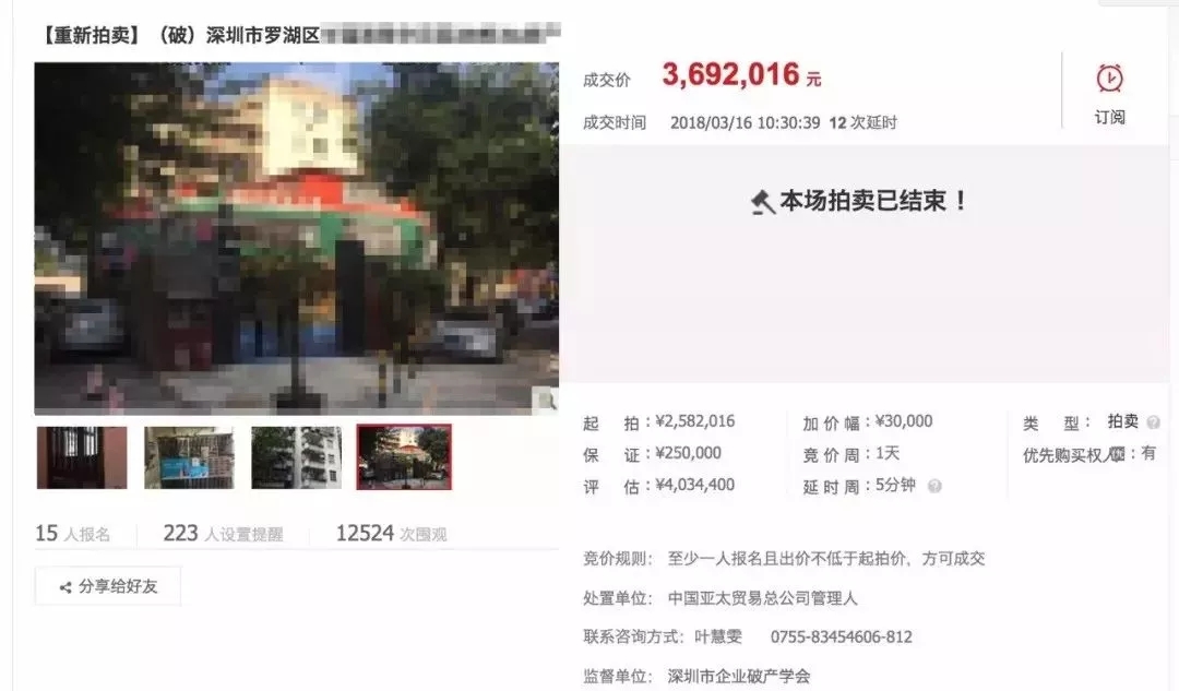 淘宝网上公开信息显示:2018年2月9日10:41:22,该套房产以3602016元成交,但最后也以弃拍告终。