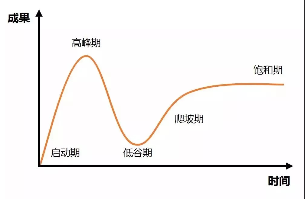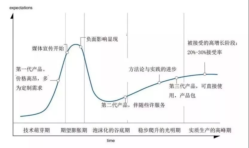借助一个用于描述技术发展周期的专业术语“Gartner曲线”来说,一个事物从萌芽到成熟,必然要经历五个阶段,即:启动期→高峰期→低谷期→爬坡期→饱和期。