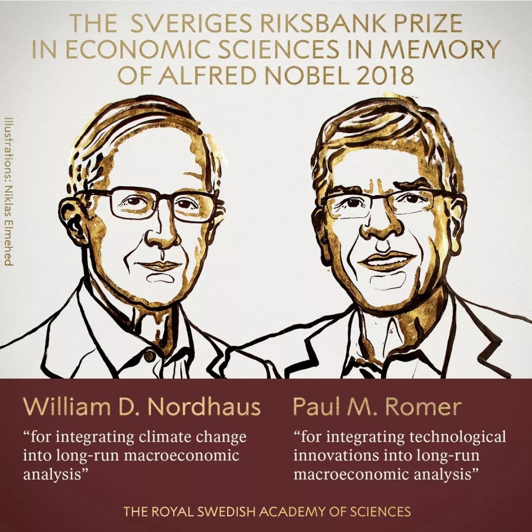 北京时间10月8日晚,2018年诺贝尔经济学奖授予耶鲁大学以全球暖化为研究主题的诺德豪斯(William D. Nordhaus)和世界银行首席经济学家保罗·罗默(Paul M. Romer),获奖理由是创新、气候和经济增长的研究。奖金金额为900万瑞典克朗,约合684万元人民币,今年是经济学诺奖的第50周年。