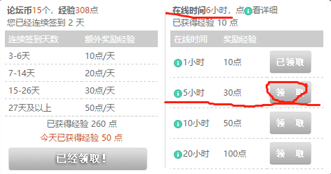 在线时间6小时,满足5小时领取30点经验值的条件,但是【领取】按钮是灰色,无法正常领取。