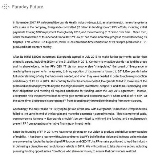 10月8日,法拉第未来在社交媒体发布公告称,其试图摆脱恒大的唯一原因是,恒大没能够履行承诺和支付同意的款项。