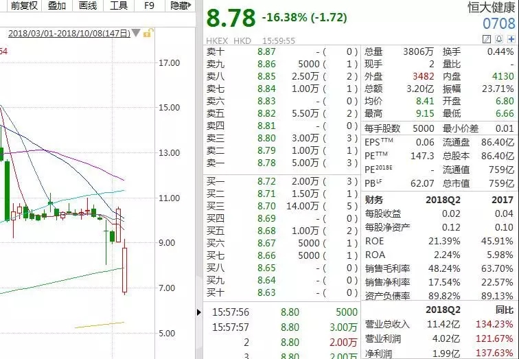受此风波影响,10月8日早盘,港股恒大健康开盘大跌逾35%,截至当天收盘,恒大健康跌16.38%报8.78港元/股。也就是说,公司市值一天缩水了148.6亿港元(折合131.5亿元人民币)。而公司在6月底宣布投资贾跃亭旗下的Smart King公司后,其股价从6月25日的4.61元一度上涨到17.64元,涨幅最高曾达到382%!