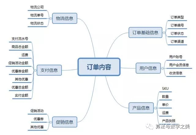以一个通用B2C商城的订单为例,梳理其包含的信息如下: