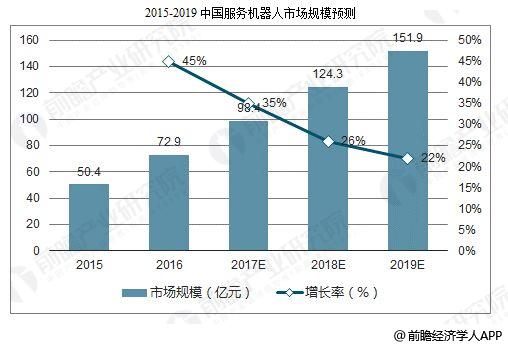 据前瞻产业研究院发布的《服务机器人行业发展前景与投资战略规划分析报告》数据显示,2016年中国服务机器人市场规模达到 72.9 亿元人民币,同比增长 44.6%,未来三年将继续增长,到 2019年市场规模将达到 151.9 亿元人民币。