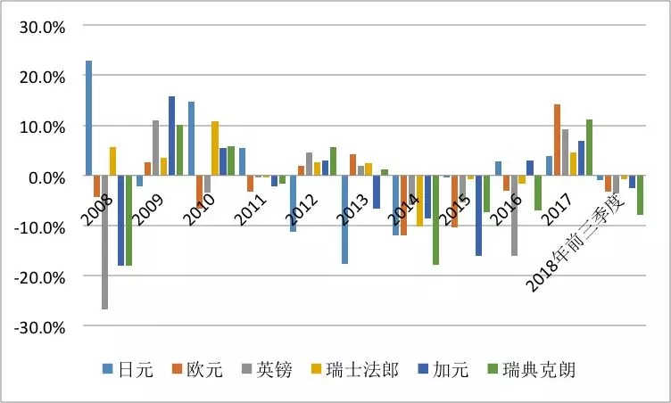 图5:ICE美元指数的权重货币各年兑美元汇率变动幅度(单位:%)
