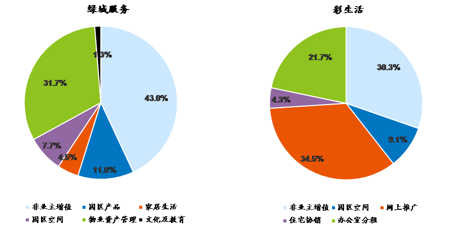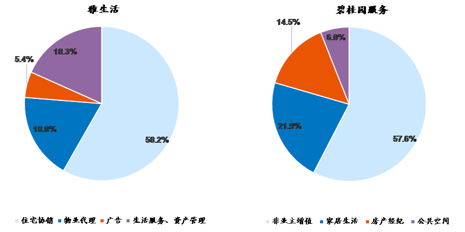 睿信地产研究院挑选了几家典型企业2017年增值服务业务结构进行了深入剖析,非业主增值服务占比较大,如碧桂园服务与雅生活服务非业主增值服务占比近60%,另外碧桂园服务及彩生活占比也在30-40%左右。业主增值服务方面,服务品种丰富,如绿城服务,包括园区产品服务、家居生活服务、园区空间租赁、物业资产管理、文化及教育等方面,特别是物业资产管理所带来的收入占比超30%。彩生活的业主增值服务包括园区空间、网上推广、办公室分租等,其中网上推广服务的营收占比近35%。雅生活的物业代理、生活服务与资产管理占比分别达18%以上。碧桂园服务则以家居生活服务为主,其次房屋经纪所带来的营收占比也近15%。
