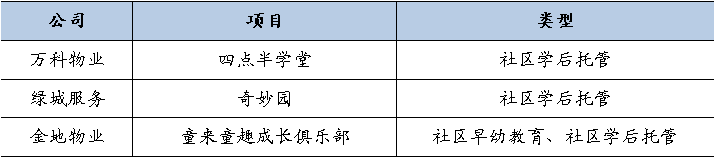 目前,已有部分物业服务企业已涉足社区教育领域,物业服务企业拥有场地及设施的主导权,通过长期服务业主取得的家庭信息及信任优势,通过自建团队或与教育机构合作引入教学资源,在社区内开展教育服务,开启“物业+教育”的服务新模式。具体包括社区早幼教育,即面向社区内学前儿童,提供“家门口”的早教服务;社区学后托管,面向社区内12岁以下儿童,提供放学后的托管服务;社区K12课外辅导,面向K12学生,将场所搬进社区,提供“家门口”的课外辅导。目前开展此类业务的典型物业企业包括万科物业、绿城服务及金地物业等。