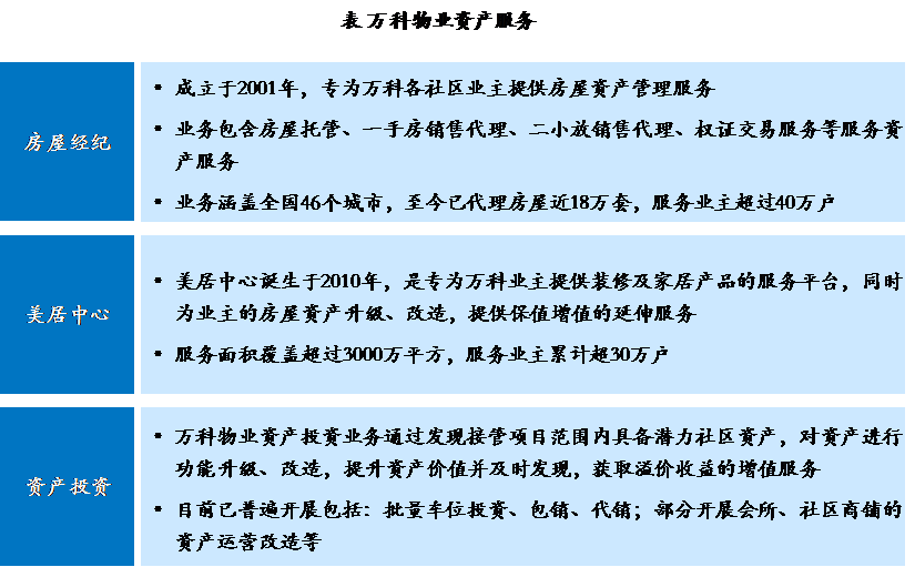 以万科物业为例,“朴邻”(前称“万科租售中心”)成立于2001年,专为万科各社区业主的提供房屋资产管理服务。业务包含房屋托管、一手房销售代理、二手房销售代理、权证交易服务等房屋资产服务。从2015年开始,万科租售中心开启市场化运营之路,2016年,在上海成立首家朴邻房产经纪有限公司的基础上,万科租售中心从经纪业务衍生出房屋二次装修业务。2018年5月28日,原万科租售中心正式更名为朴邻•万科物业二手房专营店,分布在全国的355家门店同时揭牌亮相。除了租赁市场,万科物业也延申至房屋有关资产服务,包括家装和社区资产投资。