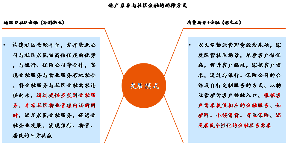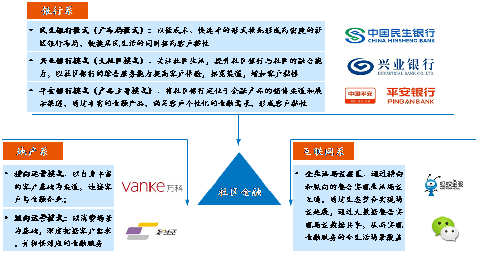 社区金融,主要介入者有三类,包括银行系、地产系、互联网系。银行系主要布局社区银行,截止2017年,全国社区网点改造8170个,民生、兴业、光大、浦发等处于领先地位,占市场份额25.6%。互联网系,通过横向、纵向、生态、大数据整合,实现全生活场景的金融覆盖,如蚂蚁金服的社区金融生态圈。地产系目前有两种方式,一种是通路型金融、一种是消费场景+金融。
