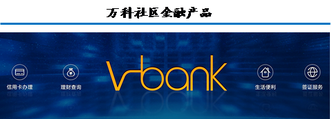 万科推出的V-bank,定位为社区金融服务增值平台,V-bank推出贷款、理财、出国签证、信用卡、生活服务等产品,把业主的金融需求和银行的金融产品精准联通,建立金融服务自选超市,为客户打造最全方位、最优质的社区金融服务增值平台。