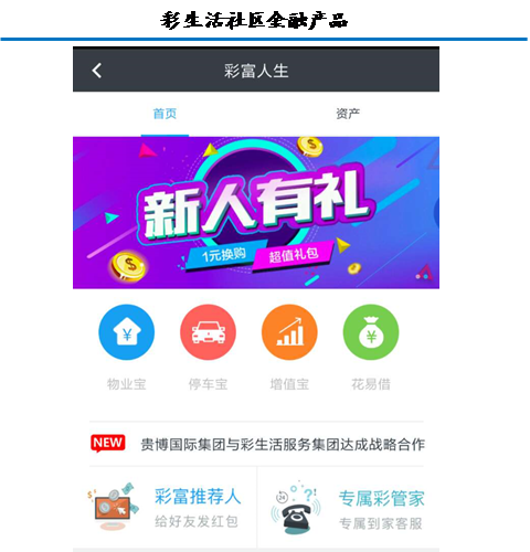 彩生活消费场景+金融模式,其中部分场景为自营或股权孵化,提供多种金融产品,目前包括物业宝、停车宝、增值宝和花易借四个产品,满足用户的不同需求。其中前两者分布是用收益冲抵物业管理费和停车费;增值宝是普通的理财产品,不冲抵;花易借为互联网贷款。将缴费与投资需求结合,彩富人生以“解构+重构”社区场景的方式,将缴纳物业费、停车费场景与业主的投资需求相结合,未来还将延伸至家政、维修等其他增值服务场景的冲抵;同时产品享受高于银行存款利率的理财收益,其复购率已经提升到30%,每笔交易金额已突破3万。同时,布局线下客户经理,除了线上APP的推广,彩富人生还布局了线下的客户经理,建立与客户之间良好的信任关系,实现信任关系的货币化。