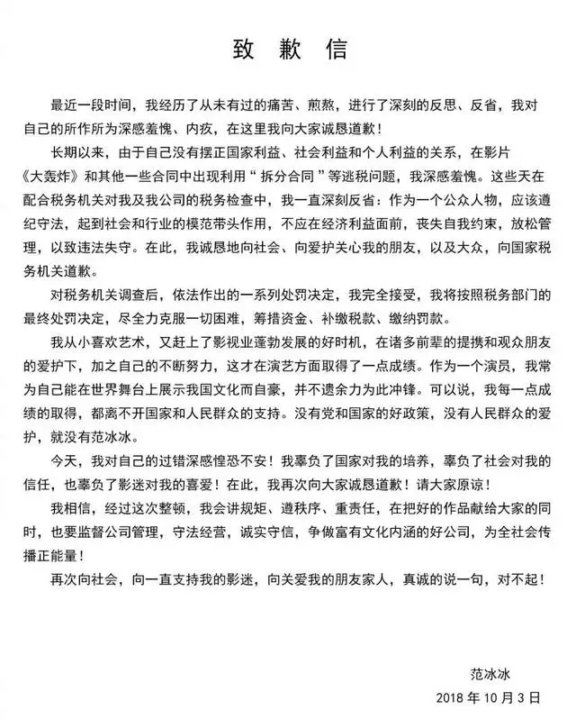 10月3日,范冰冰在微博上就逃税问题发出“致歉信”,我们能够从这封信中感受到范爷一改前非的诚意,知错能改,善莫大焉。不过,我们也在致歉信中发现了不少语法和标点错误,于是想利用这封信,再普及一下语法和标点的基础知识。