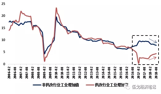 滞胀往往发生在总需求不断下滑且遭遇大幅成本冲击的时期,目前我国并不具备持续滞胀的客观条件。首先,国内供给侧改革目前似已步入下半场,政策约束边际放松迹象已开始显现。例如,今年以来受供给侧改革影响的行业与非供改行业的生产增速差距已经明显收窄。其次,近期公布的环保政策更是降低了空气质量改善目标并明确禁止“一刀切”式的限产,今年采暖季工业生产受到的扰动会同比减少。短期来看国内供给冲击的影响将逐步减弱。尽管如此,国际油价上涨带来的外部冲击仍值得密切关注。随着美国对伊朗制裁等事件的发酵,其他产油国增产幅度仍存疑,国际油价同比大概率将高位震荡。