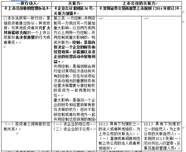 本办法所称一致行动,是指投资者通过协议、其他安排,与其他投资者共同扩大其所能够支配的一个上市公司股份表决权数量的行为或者事实。 | 第三条一方控制、共同控制另一方或对另一方施加重大影响,以及两方或两方以上同受一方控制、共同控制或重大影响的,构成关联方。控制,是指有权决定一个企业的财务和经营政策,并能据以从该企业的经营活动中获取利益。 共同控制,是指按照合同约定对某项经济活动所共有的控制,仅在与该项经济活动相关的重要财务和经营决策需要分享控制权的投资方一致同意时存在。 重大影响,是指对一个企业的财务和经营政策有参与决策的权力,但并不能够控制或者与其他方一起共同控制这些政策的制定 | -- | -- |