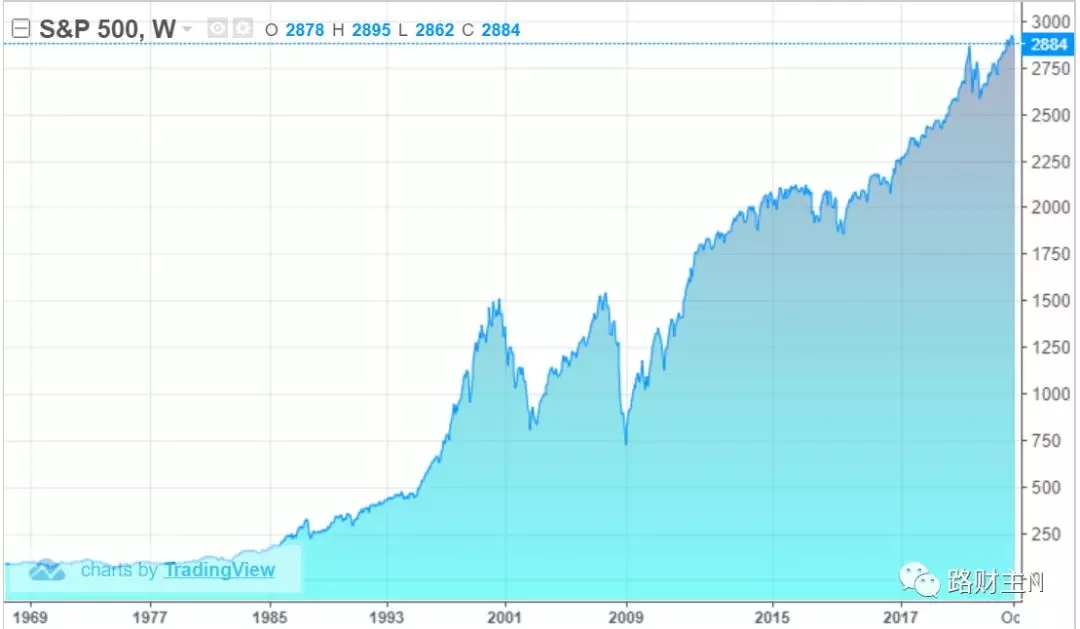 实际上,正是由于1985年以来美元十年期国债收益率区间的持续下行(上图绿色阴影区),造就了债券和股市类资产30多年的牛市(下图为标普500指数50年来的上涨情况)。