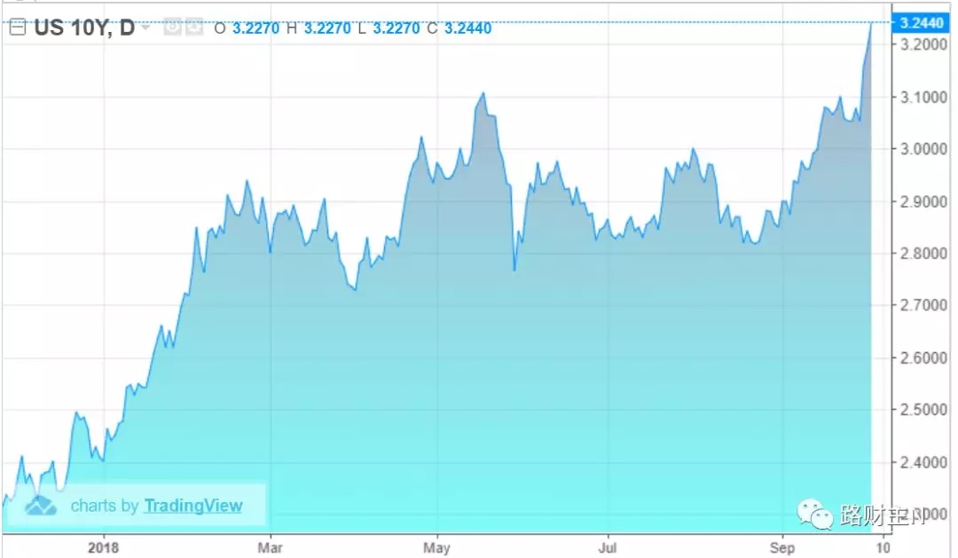 自2018年以来,美国十年期国债收益率就一路攀升,继5月中旬突破3.1%之后,现在,又突破了3.2%,最高3.25%……