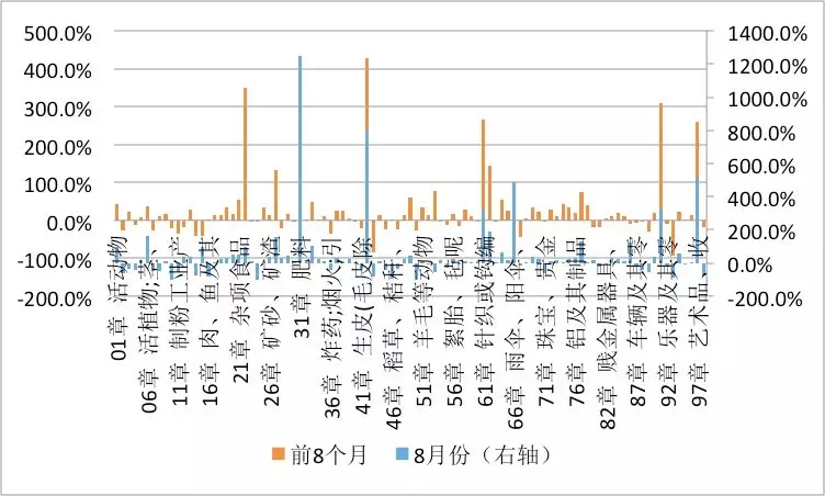 据统计,今年8月份,美国按SITC二级分类的66类出口商品中,有33类商品对华出口累计同比下降1%~95%,其中跌幅超过20%的有22类商品(见图7);而中国按HS分类的98类出口商品中,有18类商品对美出口累计同比下降2%~80%,其中跌幅超过20%的仅有5类商品(见图9)。