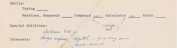 下面是“特殊技能”,乔布斯填的是:“电子技术、设计工程”。
