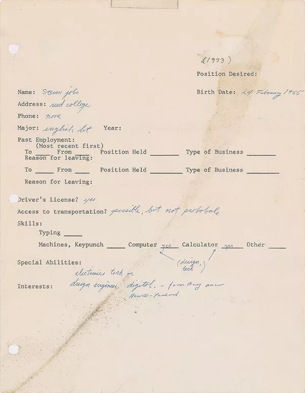 据外媒报道,乔布斯在1973年所填写的一份工作申请表,被波士顿一家拍卖行拍卖,起拍价5万美元,约35万!
