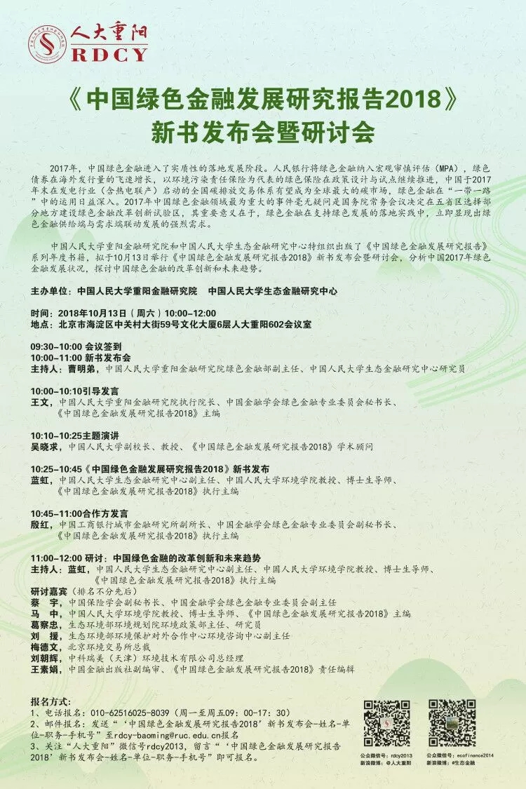 中国人民大学重阳金融研究院和中国人民大学生态金融研究中心特组织出版了《中国绿色金融发展研究报告》系列年度书籍,将于10月13日举行《中国绿色金融发展研究报告2018》新书发布会暨研讨会,分析中国2017年绿色金融发展状况,探讨中国绿色金融的改革创新和未来趋势。