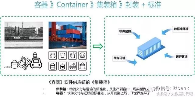 容器是 Container,Container另一个意思是集装箱,其实容器的思想就是要变成软件交付的集装箱。集装箱的特点,一是封装,二是标准。