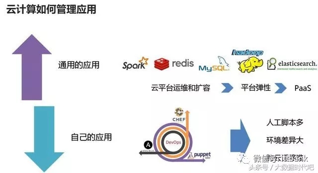 第二部分,通用的应用不用安装。所谓通用的应用,一般指一些复杂性比较高,但是大家都在用的,例如数据库。几乎所有的应用都会用数据库,但是数据库软件是标准的,虽然安装和维护比较复杂,但是无论谁安装都是一样。这样的应用可以变成标准的PaaS层的应用放在云平台的界面上。当用户需要一个数据库的时候,一点就出来了,用户就可以直接用了。有人问,既然谁安装都一个样,那我自己来好了,不需要花钱在云平台上买。当然不是,数据库是一个非常难的东西,光Oracle这家公司,靠数据库就能赚这么多钱。买Oracle也是要花很多很多钱的。然而大多数云平台会提供Mysql这样的开源数据库,又是开源,钱不需要花这么多了,但是维护这个数据库,却需要专门招一个很大的团队,如果这个数据库能够优化到能够支撑双十一,也不是一年两年能够搞定的。比如您是一个做单车的,当然没必要招一个非常大的数据库团队来干这件事情,成本太高了,应该交给云平台来做这件事情,专业的事情专业的人来自,云平台专门养了几百人维护这套系统,您只要专注于您的单车应用就可以了。