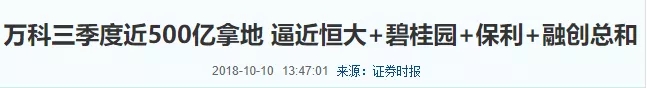 值得注意的是,据“证券时报”统计,万科三季度拿地近500亿逼近“恒大+碧桂园+保利+融创”的总和。