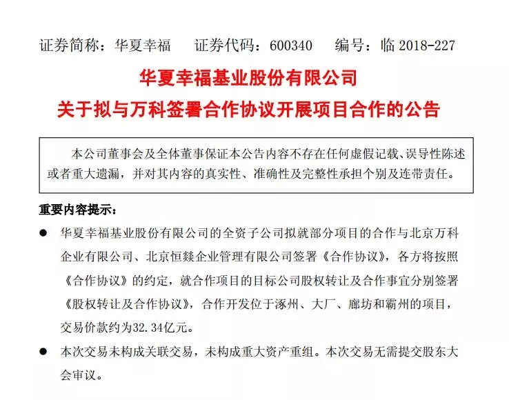 昨日晚间,华夏幸福公告,拟与北京万科企业有限公司,就华夏幸福环京区域33.93万平方米的住宅用地,签署合作协议,暂定交易价款约为32.34亿元。根据公告,万科拟通过收购华夏幸福5家项目公司的部分股权的方式,合作开发华夏幸福位于涿州、大厂、廊坊和霸州市的10宗土地项目。