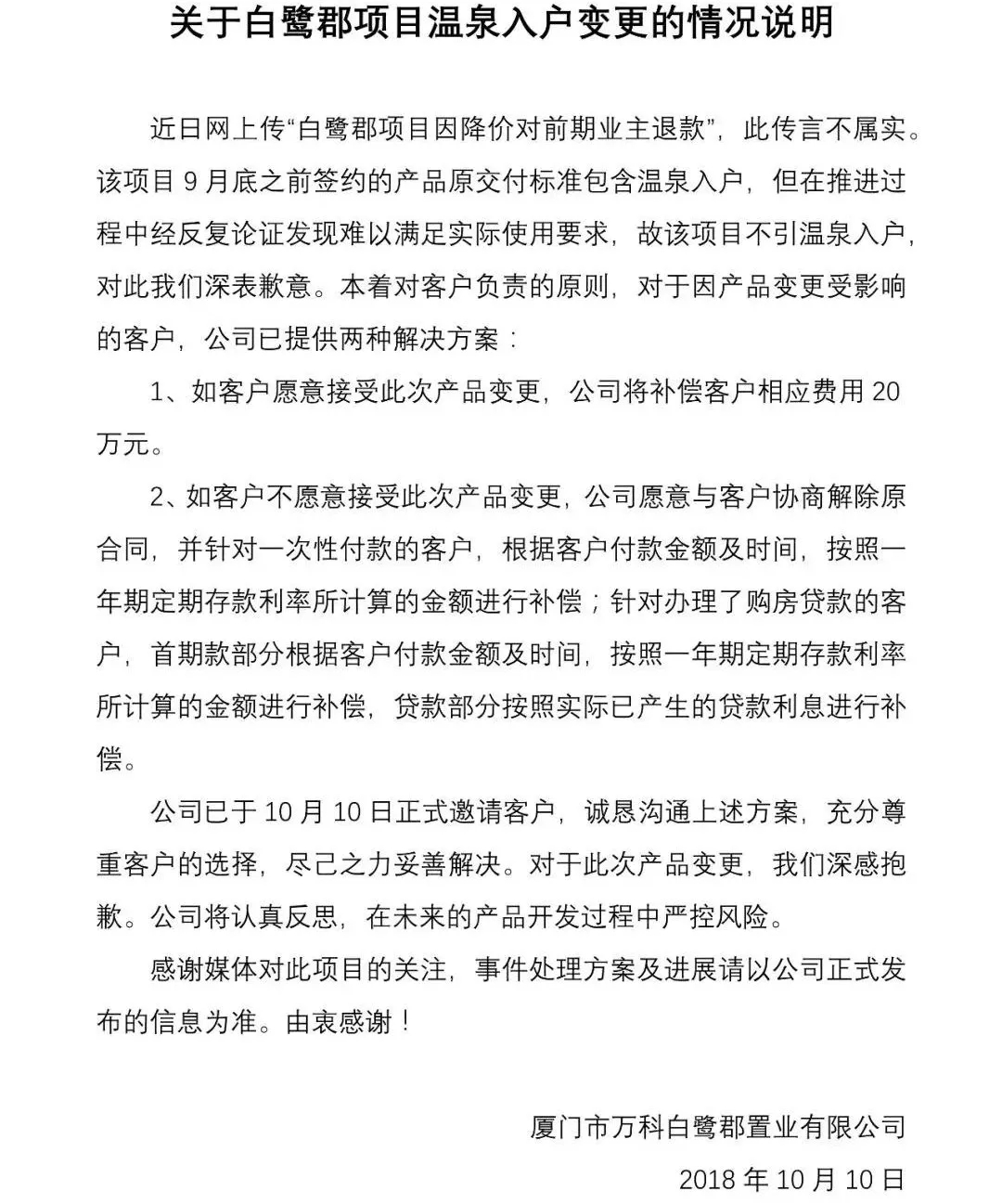 该项目9月底之前签约的产品原交付标准包含温泉入户,但在推进过程中经反复论证发现难以满足实际使用要求,故该项目不引进温泉入户。