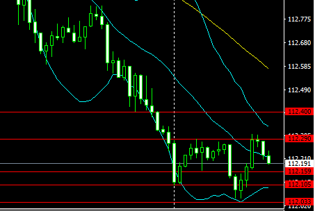 2、15分钟图压力位112.290、112.400做空,时间5分钟;支撑位112.159、112.105、112.033做多,时间5分钟(注支撑压力转换及运用)