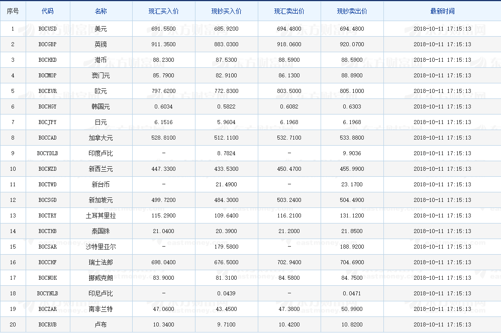 中国银行外汇牌价 2018-10-11(图片来源:东方财富网)