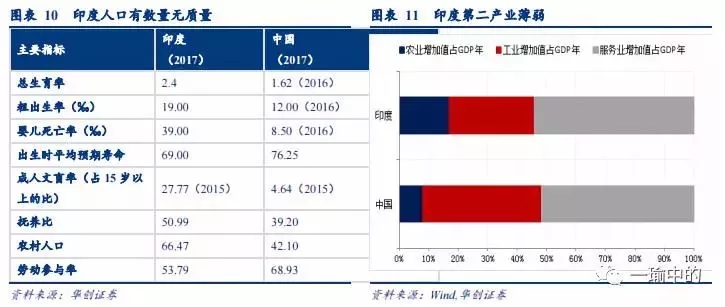 全球出现了人口红利接力棒的断档:全球人口的接力棒从二战开始到2050年分别是:美国—日本—四小龙—中国—印度—非洲,中国在2014年已经出现刘易斯拐点,人口红利的接力棒要交接到下一个国家手上。印度看上去最像中国的红利接班人,然而短期内依然很困难。印度的问题在于印度人口有数量无质量(死亡率、文盲率较高,抚养比、农村人口偏高)且产业结构哑铃型(三产结构中二产极其薄弱,营商环境较差)。