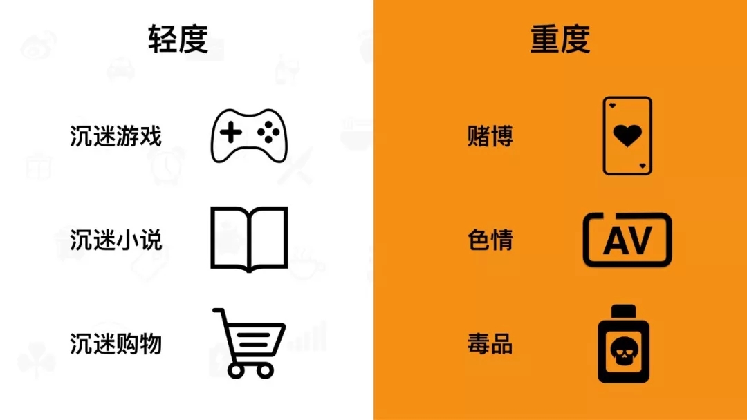 症状重甚至犯法的:赌博(轻易获得「金钱」)、色情/吸毒(轻易获得「爽」的感觉)等。