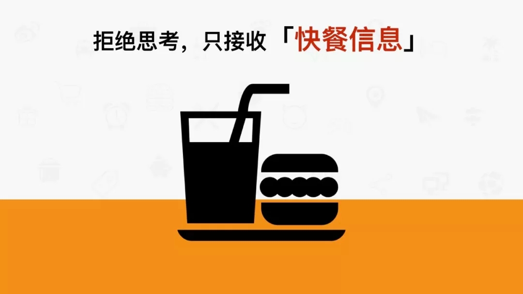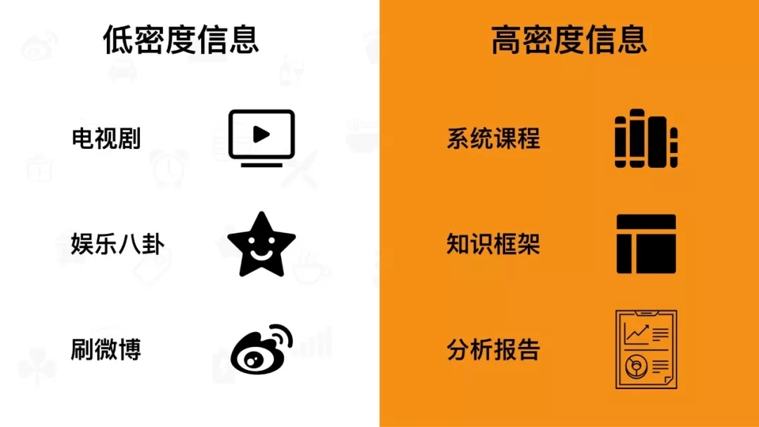 只愿意接收信息密度低的信息(如无需太多动脑的视频、图片,以及深度较浅的娱乐、八卦、体育新闻等),不愿意接收信息密度高、需要思考后才能吸收的信息(如课程、知识框架、分析报告等)。