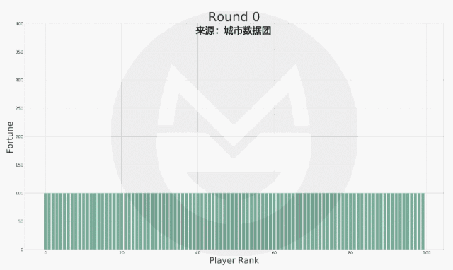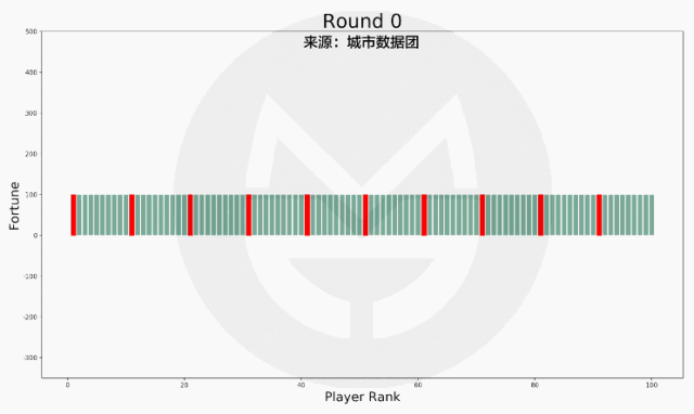 如上图,横轴标签代表玩家排序(非编号),排序越高的财富越多。初始时所有人的财富值相等,随着游戏的进行,财富值差距越来越大!