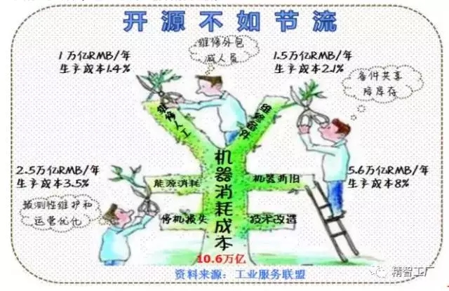 经济增长减速时代,开源不如节流,工厂成本主要发生在“人、机器、原材料”上。料的成本靠管理,比如供应链管理和丰田零库存管理;人的成本靠技术,比如机器人替代和人工智能替代;机的成本靠互联网连接,比如预测性维护和共享经济。用在“机器”这块的成本占生产经营成本的15%,放到全国来说就是10万亿,这一块成本以前没有受重视。