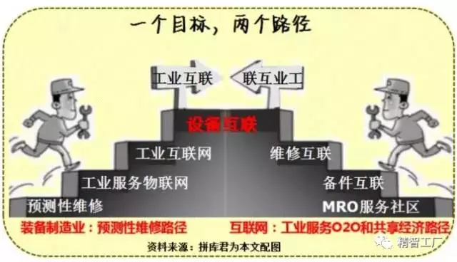 装备制造企业沿着预测性维护入口进军工业服务,互联网企业沿着共享经济入口进军工业服务,这两种模式都会促使工厂设备跟工厂外部设备发生数据上的连接与共享,最终都会到达同一个目的地:工业互联网。