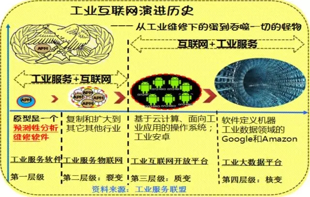 机器是工业的核心,GE的“互联网+工业服务”的模式成了全球工业互联网的领导者,所以本文重点针对这种模式展开分析讨论。拼库君总结出了工业互联网的四个层级,接下来描述一下工业互联网如何从一个“工业维修下的蛋”,经过量变、质变、核变,最终发展成一个吞噬工业的怪物。