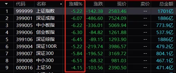受昨夜美股暴跌影响,今日A股大幅低开后,随之震荡跳水。上证指数收跌5.22%,深证成指收跌6.07%,创业板指大跌6.3%;上证指数收盘报2583.56点,跌破2016年1月份2638“熔断底”,创近4年来新低;而深证成指和创业板指更是续创4年新低。上证成交额1701亿元、深证成交额1886亿元,两市成交额合计3587亿元。