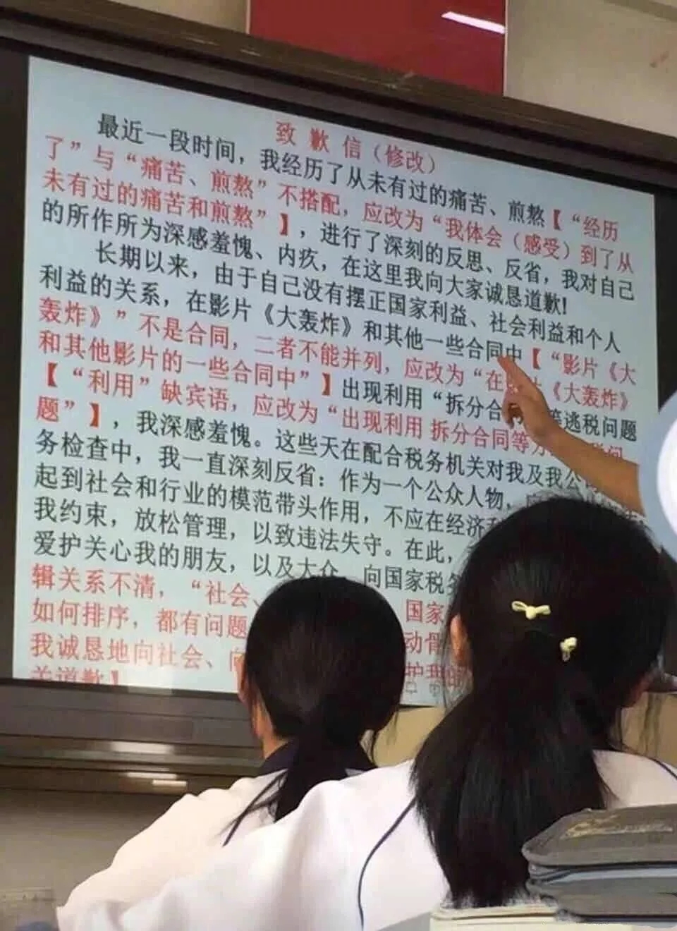 For a long period of time, I did not uphold the responsibility of safeguarding the interests of my country and our society against my personal interests. I feel ashamed that I committed tax evasion in “Unbreakable Spirit” and other projects by taking advantage of “split contracts.” Throughout these days of my cooperation with the taxation authorities’ investigation of my accounts as well as my company’s, I have realized that, as a public figure, I should’ve observed the law, setting a good example for society and the industry. I shouldn’t have lost my ability to govern myself in the face of economic interests, leading myself to break the law. Here I sincerely apologize to society, friends who care about me, the public and the taxation authorities.